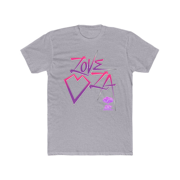 A soft, lightweight cotton crew tee printed with a laid-back purple "We Love LA" design that feels like a sunny afternoon on the boulevard. The print has a slightly retro font vibe — not loud, just confident — so you can wear it while wandering neighborhood shops, meeting friends for coffee, or layering under a denim jacket for evening walks. The fabric drapes easily and the classic crew neckline keeps the silhouette familiar and wearable. This tee settles into your rotation fast: it handles frequent wear, keeps its shape thanks to subtle structural details, and carries a small-town-meets-city energy that resonates whether you grew up in LA or visit for the first time.